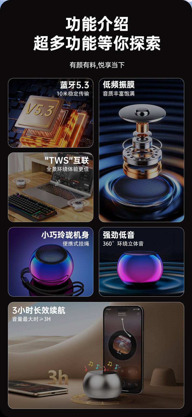 2分鐘前炫彩無線藍牙音箱,戶外便攜,小音響大音量,多重音效, 360°全向音效 - 3入組 均價433!NT$1299